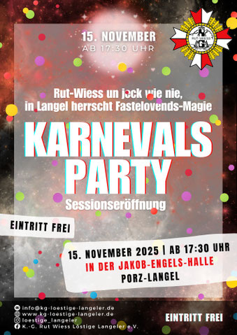 Am 15.11.2025 wollen wir wieder gemeinsam in die neue Session starten. Ab 17.30 Uhr feieren wir in der Jakob-Engels-Halle das es in Langel Fastelovends-Magie gibt.